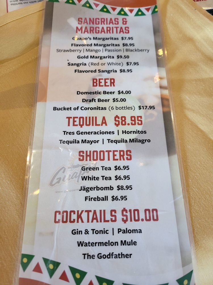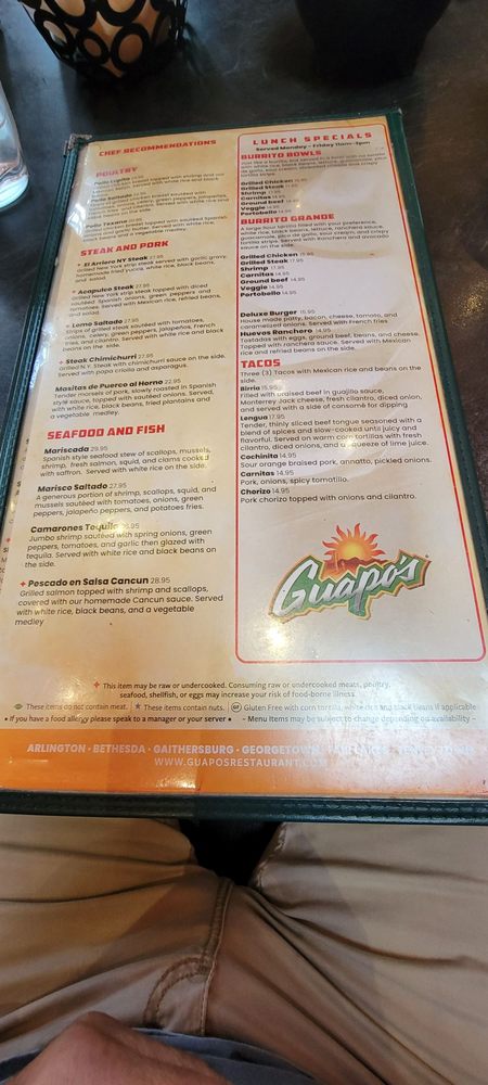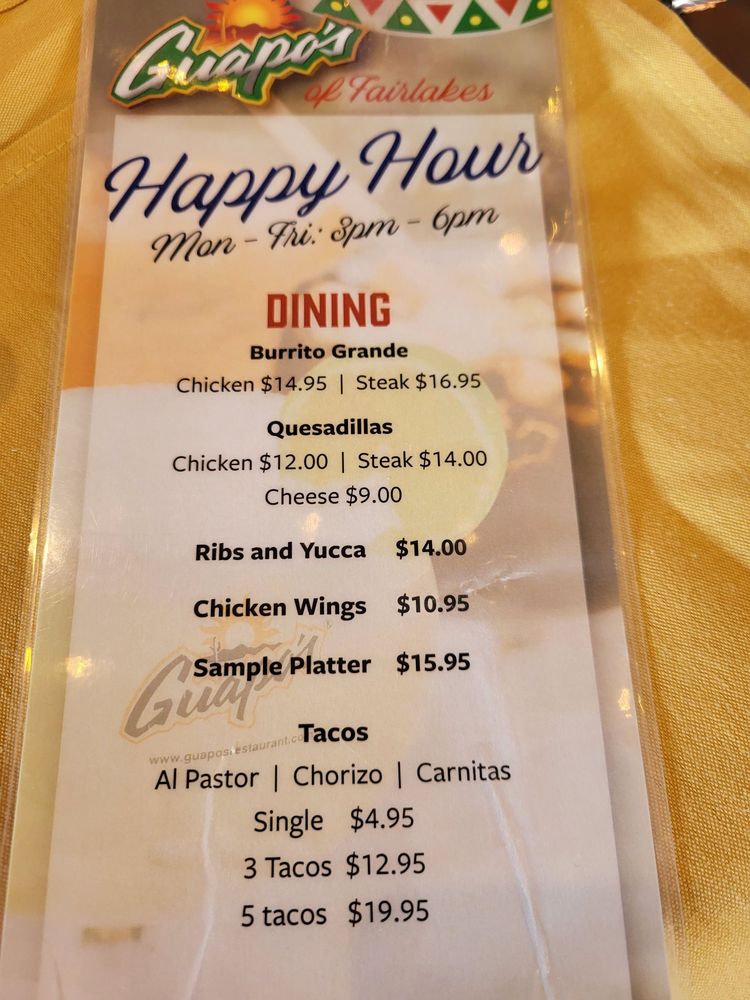 Guapo’s Fairlakes in Fairfax, Virginia, offers a vibrant Mexican dining experience with a range of amenities including reservations, delivery, vegan and vegetarian options, wheelchair access, and outdoor seating. Customers rave about the delicious food and friendly atmosphere, with standout dishes like shrimp diablo fajitas, fresh guacamole, and flavorful Birria Tacos with rich consommé. The restaurant is known for its festive vibes, singing waiters, and tequila shots during Cinco de Mayo. While some reviewers note occasional service lapses, the overall consensus is positive, highlighting the mouthwatering seafood enchiladas and well-seasoned dishes. Prices are on the higher end but worth it for special occasions. Guapo’s Fairlakes is a go-to spot for Mexican cuisine with a fun, family-friendly ambiance.