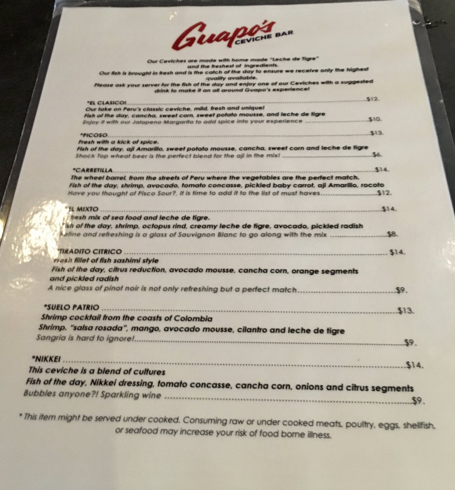 Shrimp topped with Mexican relish, cabbage, queso fresco and Guapo's signature "Patron" Sauce.