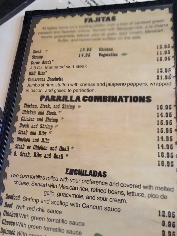 Grilled Chicken, Steak, Camarones Diablo, Baby Back Ribs and two chorizos.